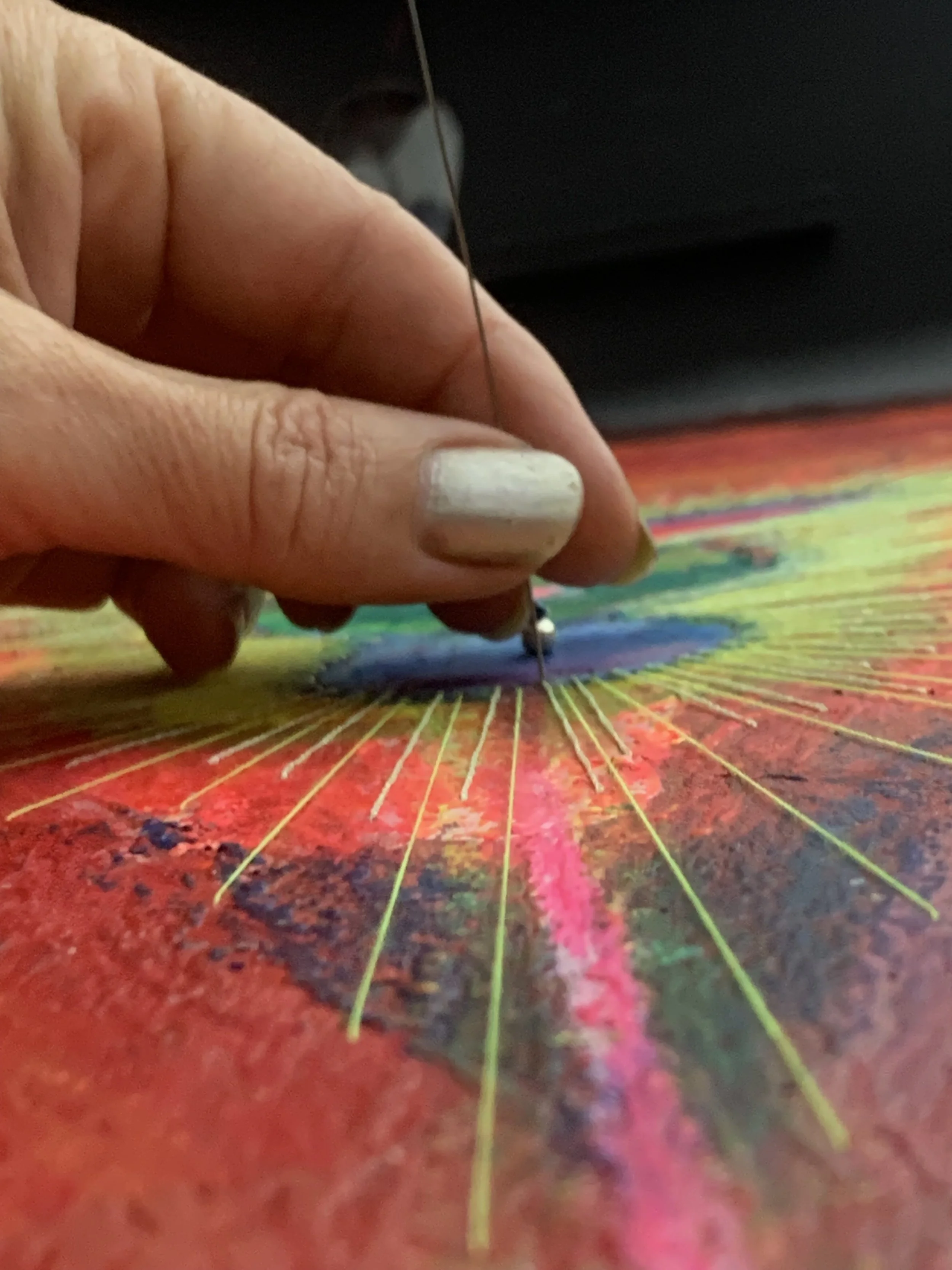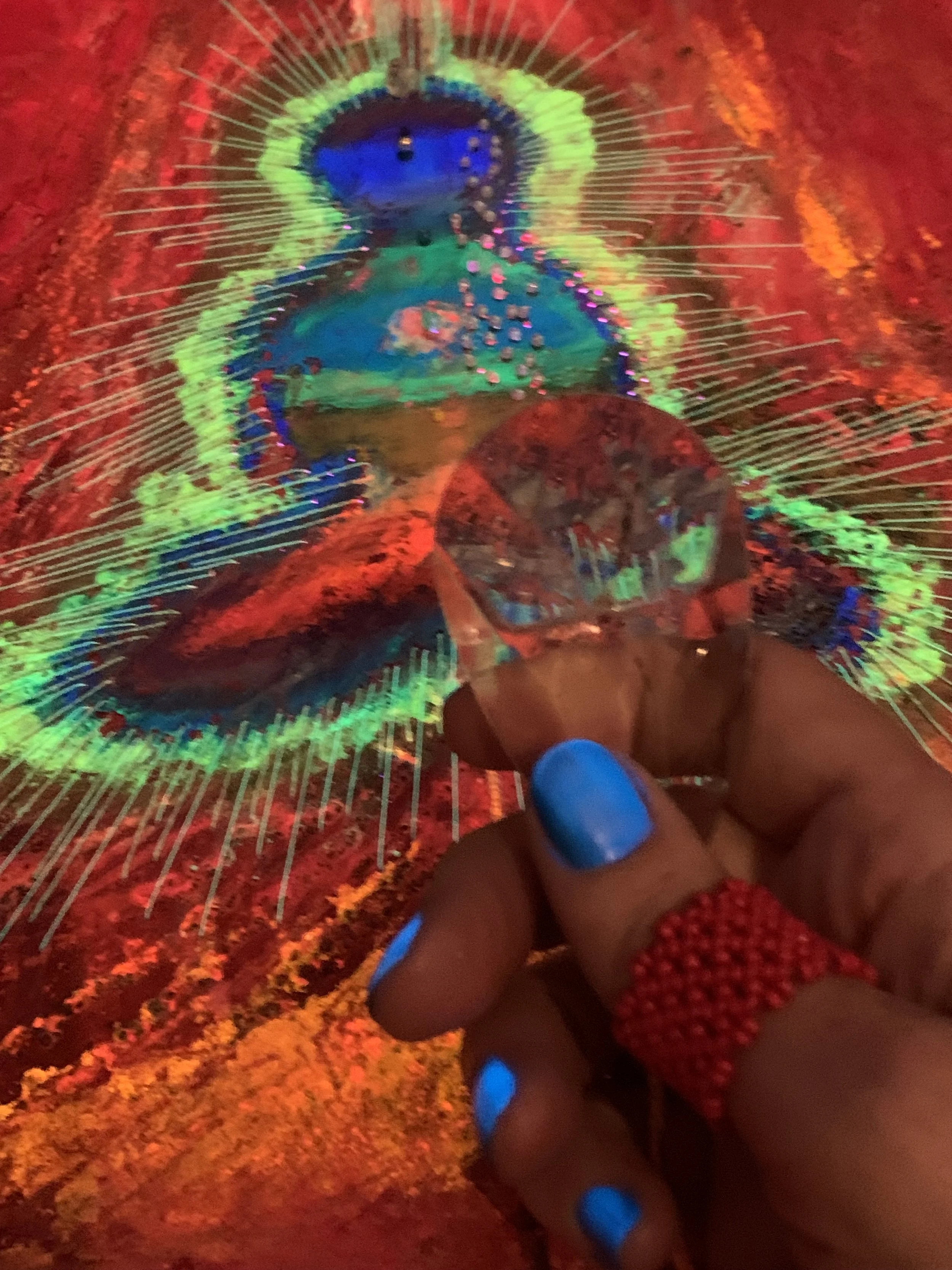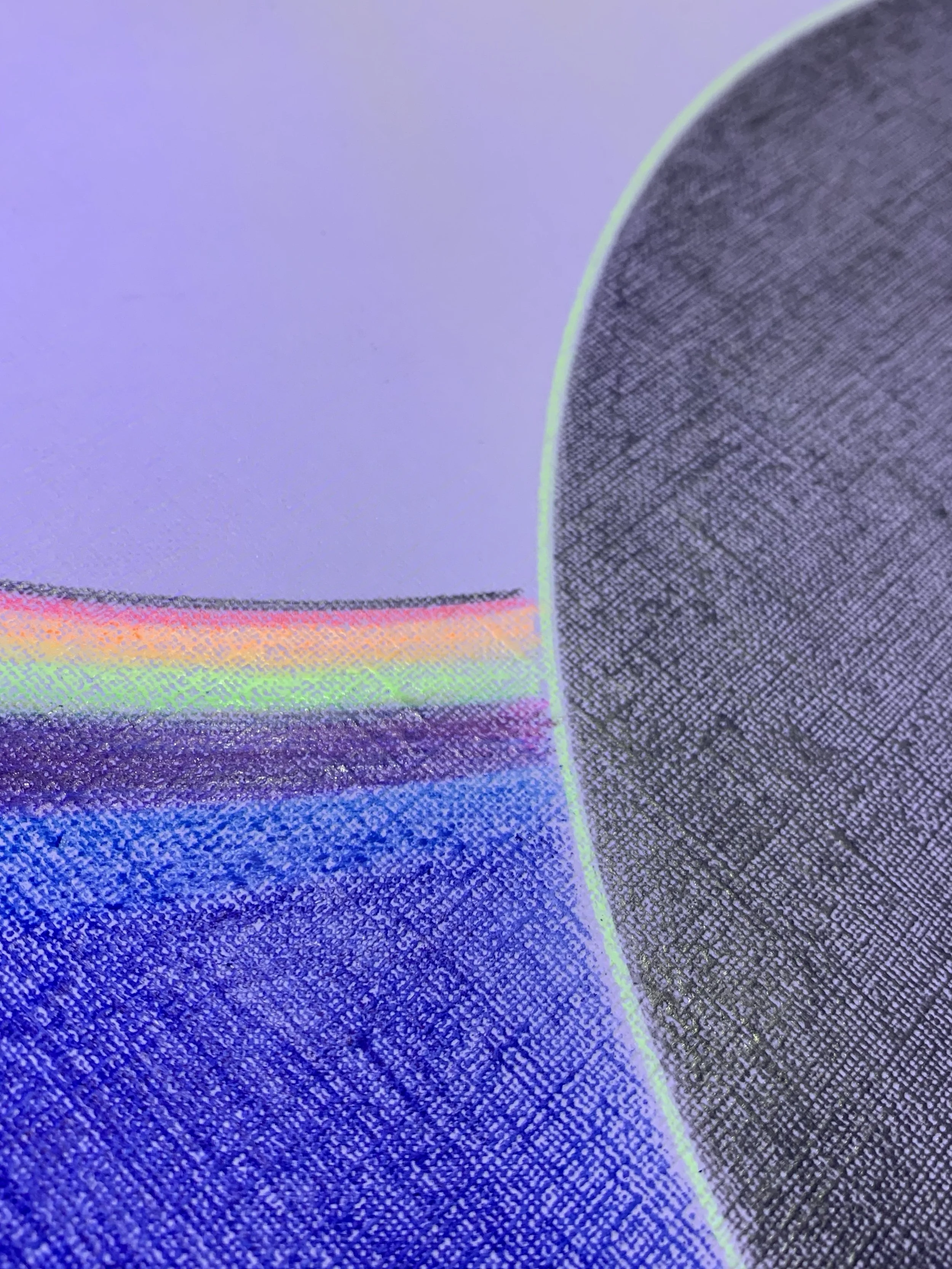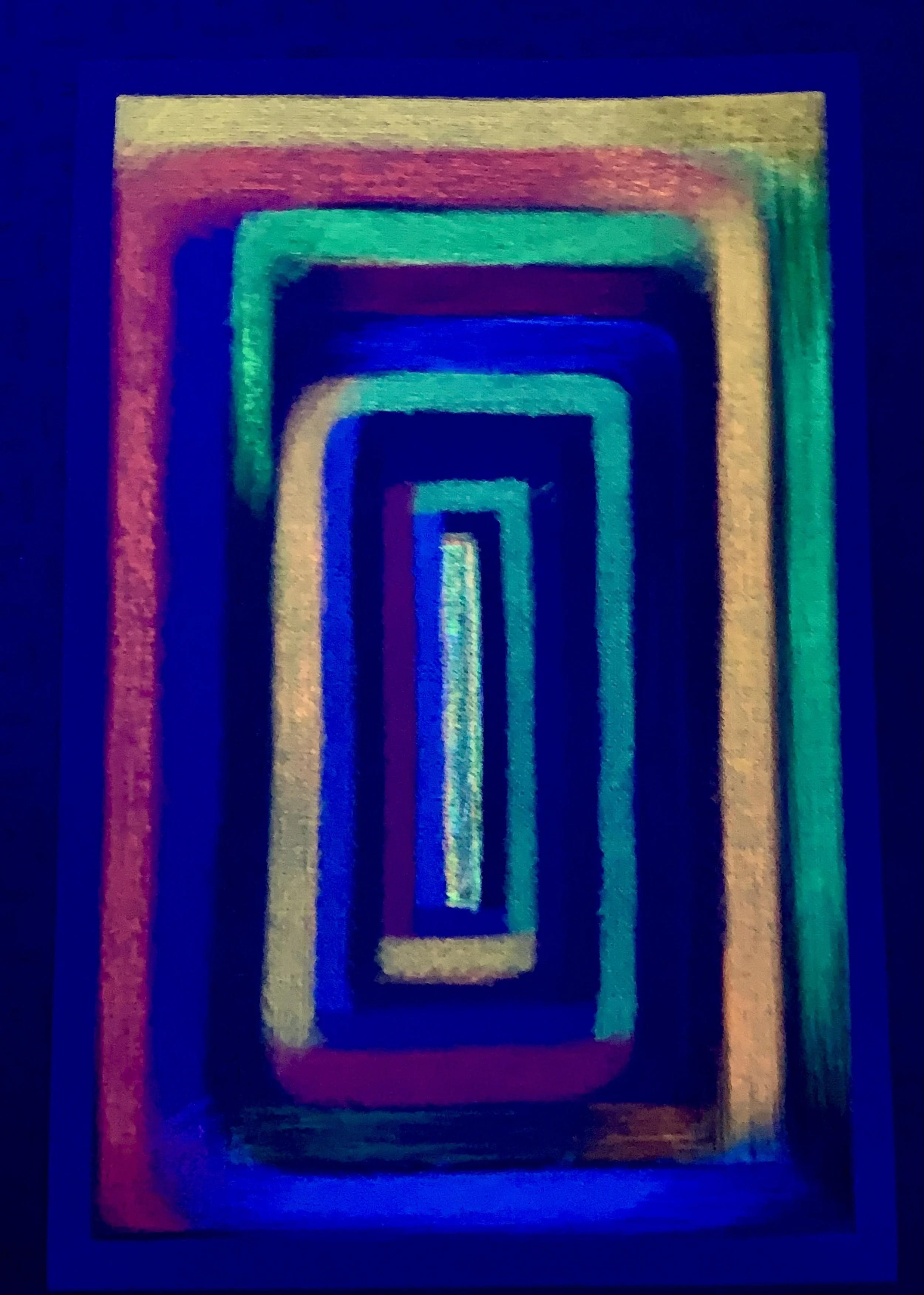 Serie de obras que exploran el umbral entre lo visible y lo invisible a través de la luz, el color y la materia. Algunas piezas se manifiestan como cajas lumínicas con pigmentos y transparencias; otras como lienzos bordados y perforados, donde el hilo atraviesa la tela y se transforma bajo la luz ultravioleta.