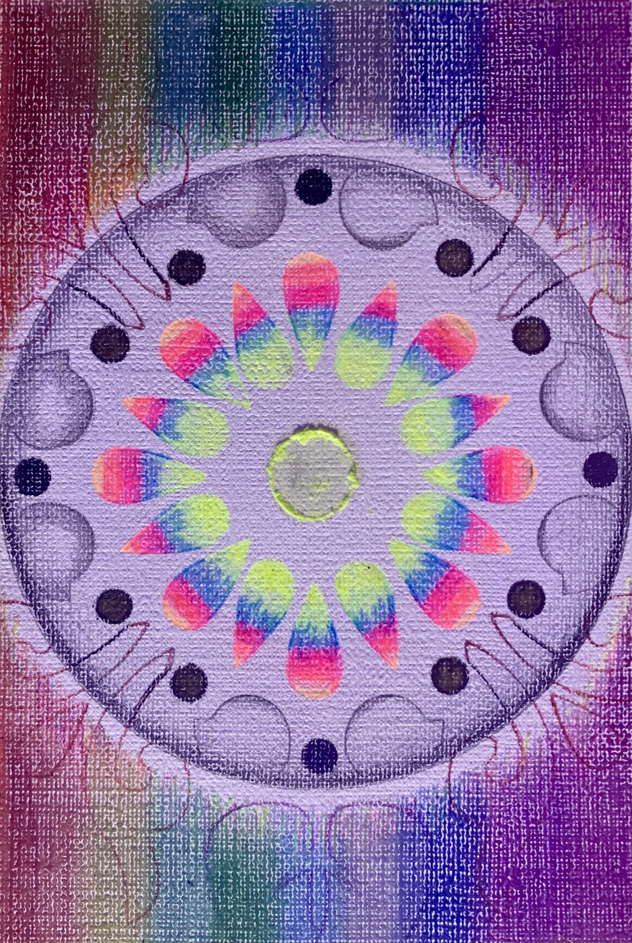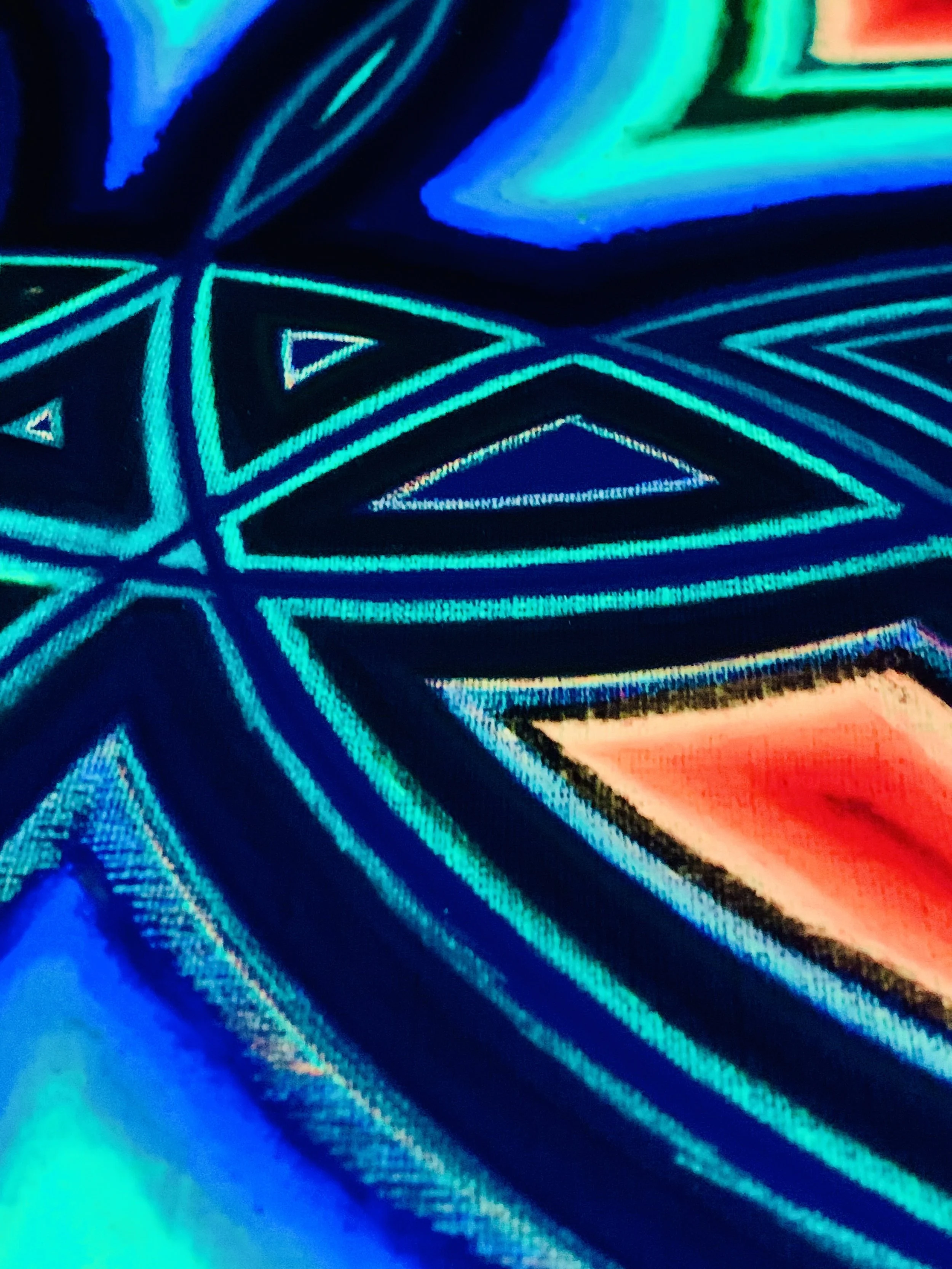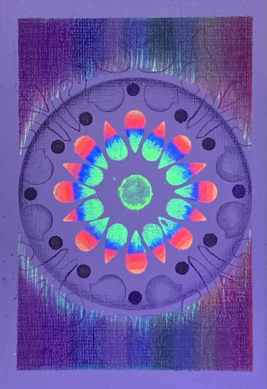 Trabajando con grafito, colores fluorescentes y pasteles, las obras exploran el contraste entre precisión y espontaneidad, entre control y fluidez. Cada trazo se asienta en el papel como una huella irreversible, recordando que en el arte —como en la vida— cada gesto nos conduce a un punto de transformación.