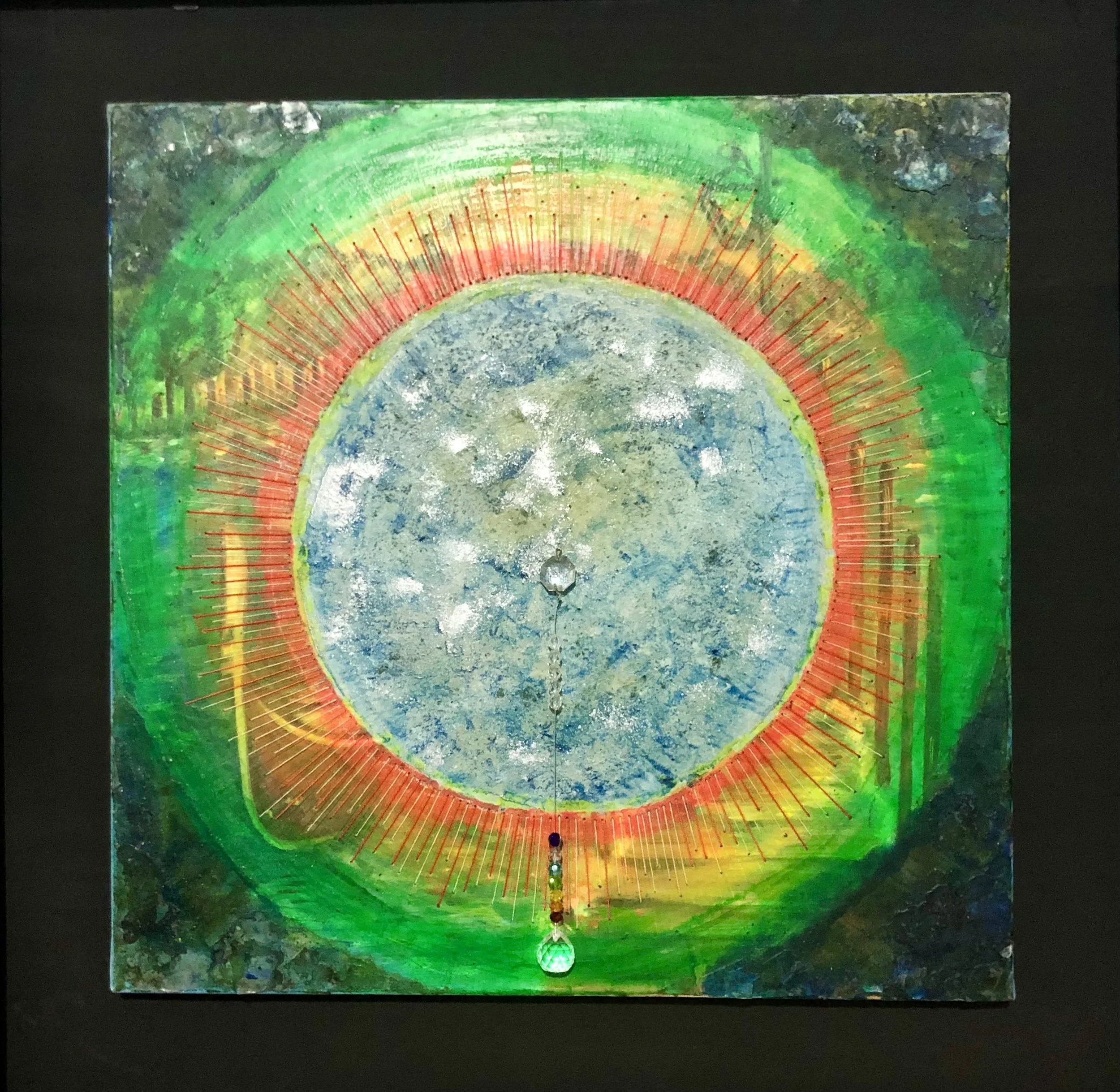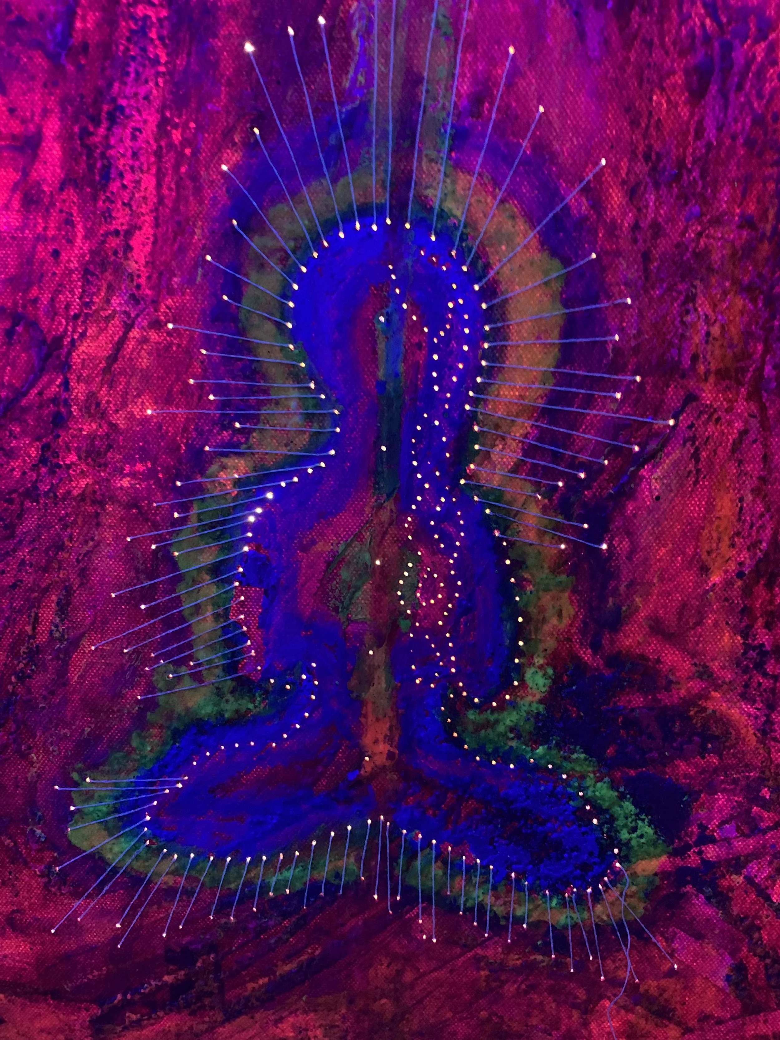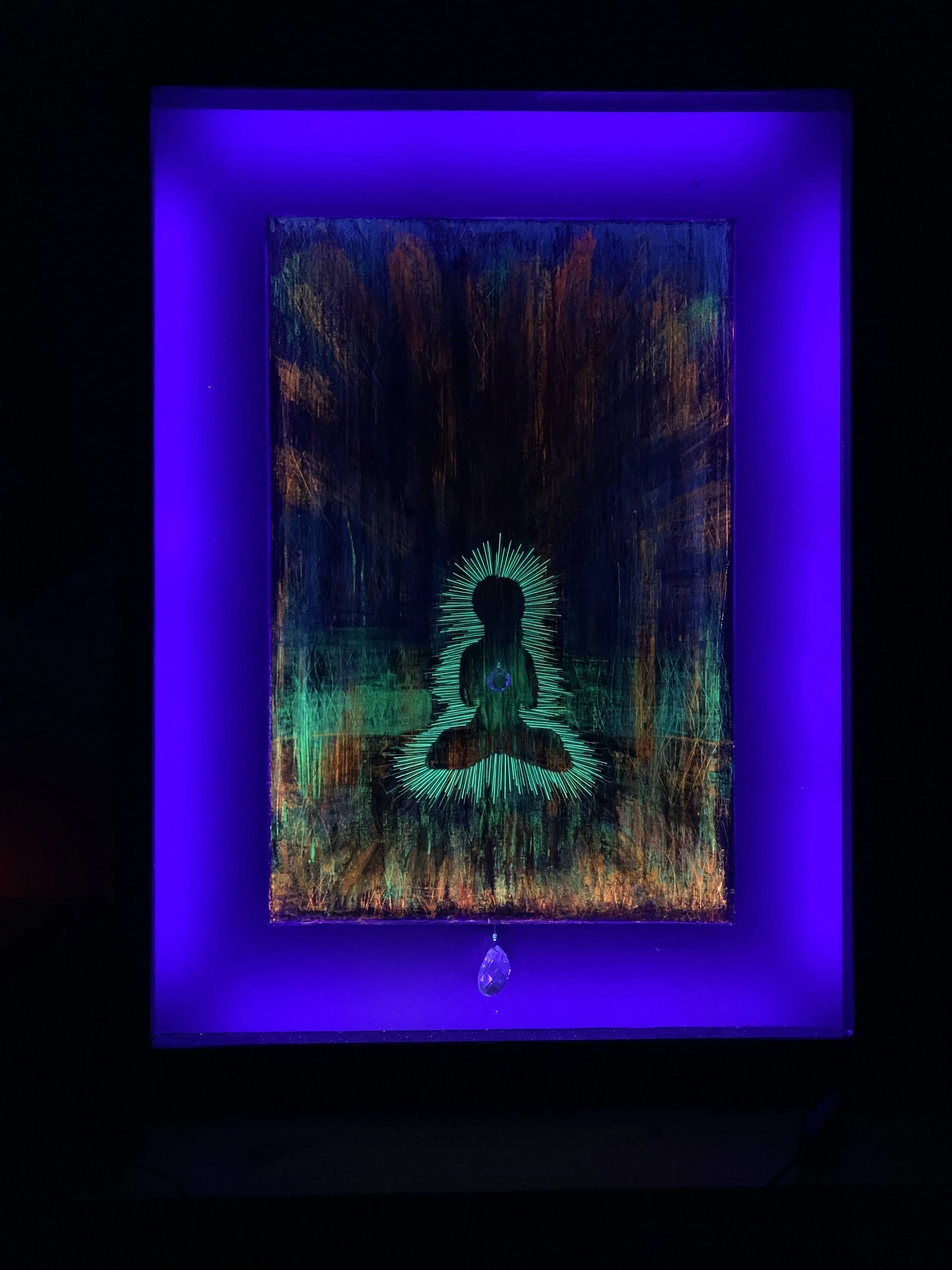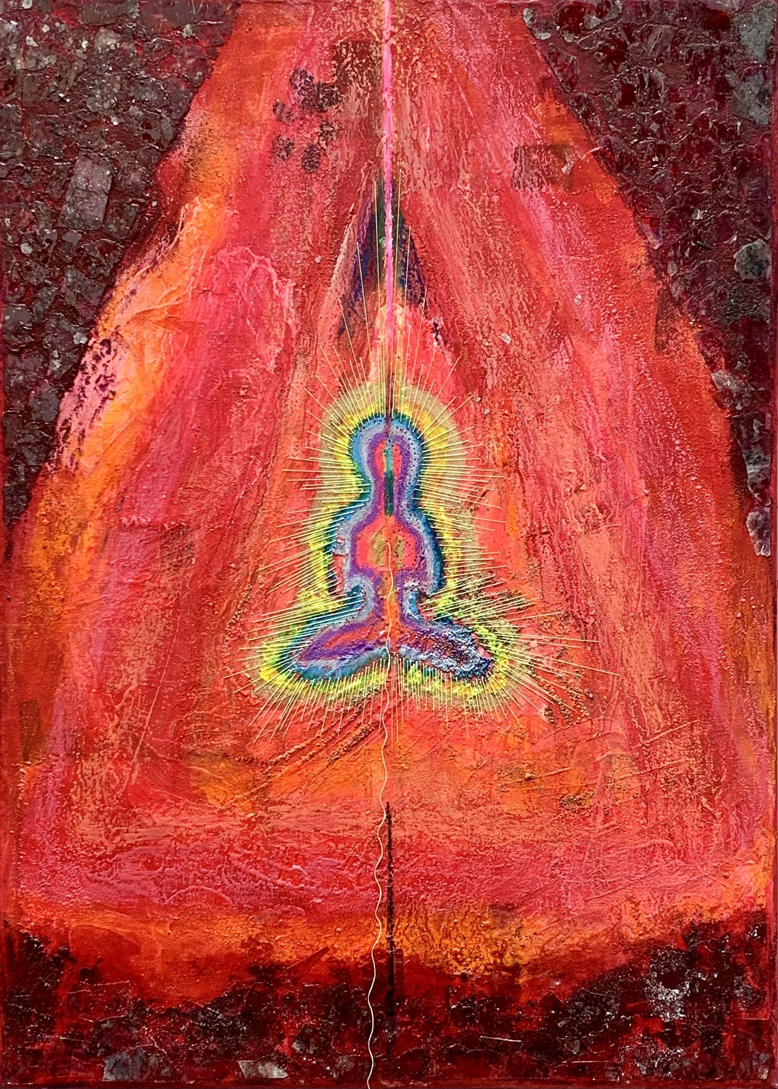 La obra central, En Eje, introduce la serie Las Meditadoras, donde la figura humana y el péndulo se entrelazan en una búsqueda de alineación energética. Con la incorporación de luces LED y materiales lumínicos, la pieza trasciende el plano pictórico para convertirse en una experiencia sensorial, irradiando calma, unidad y conexión.