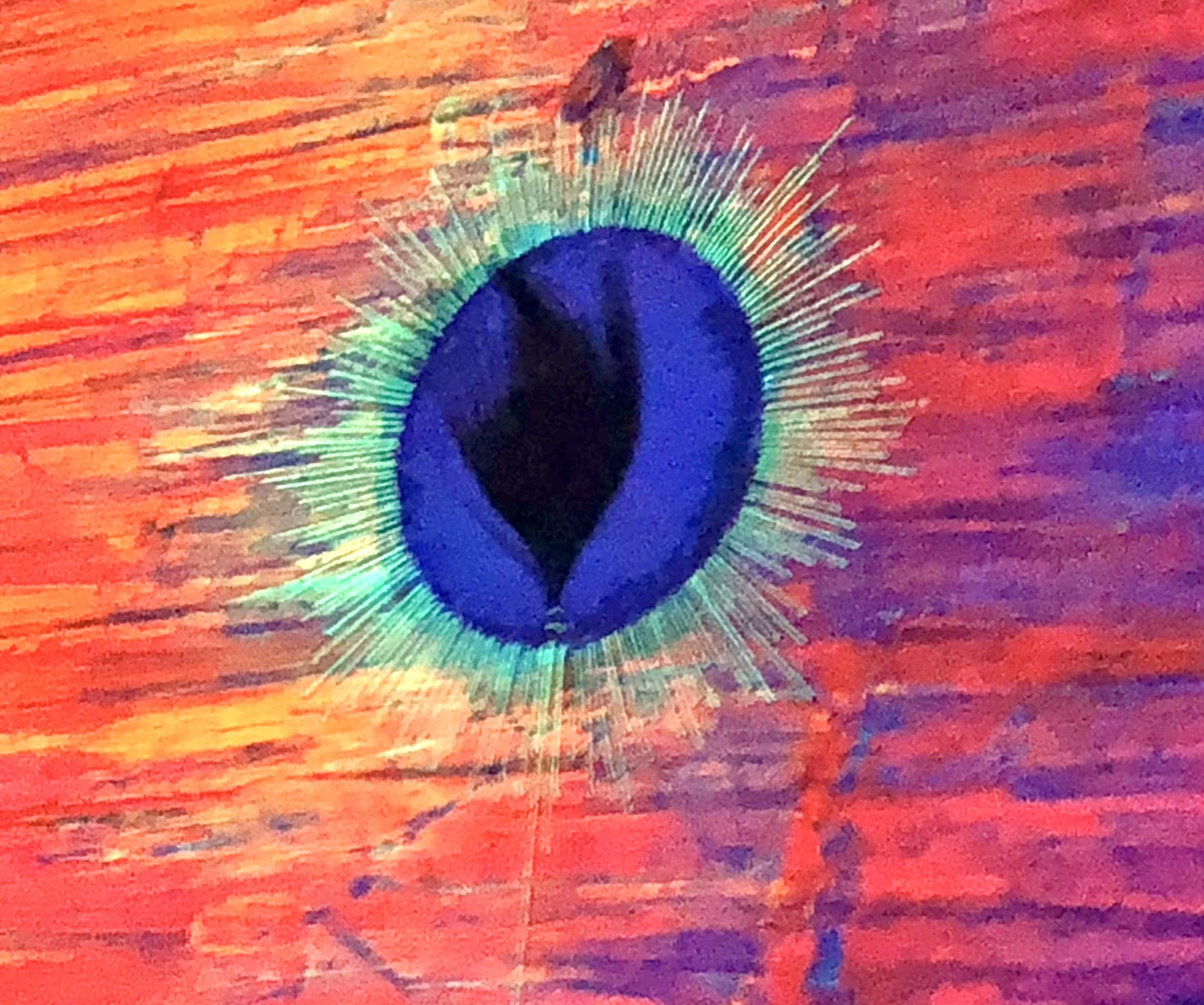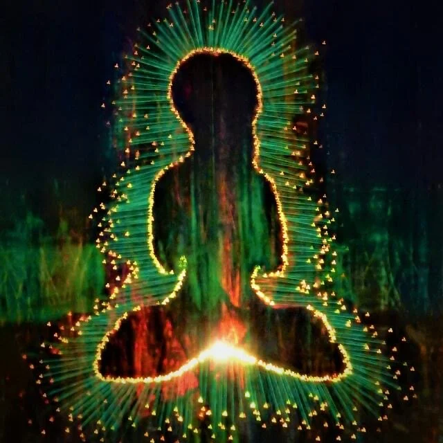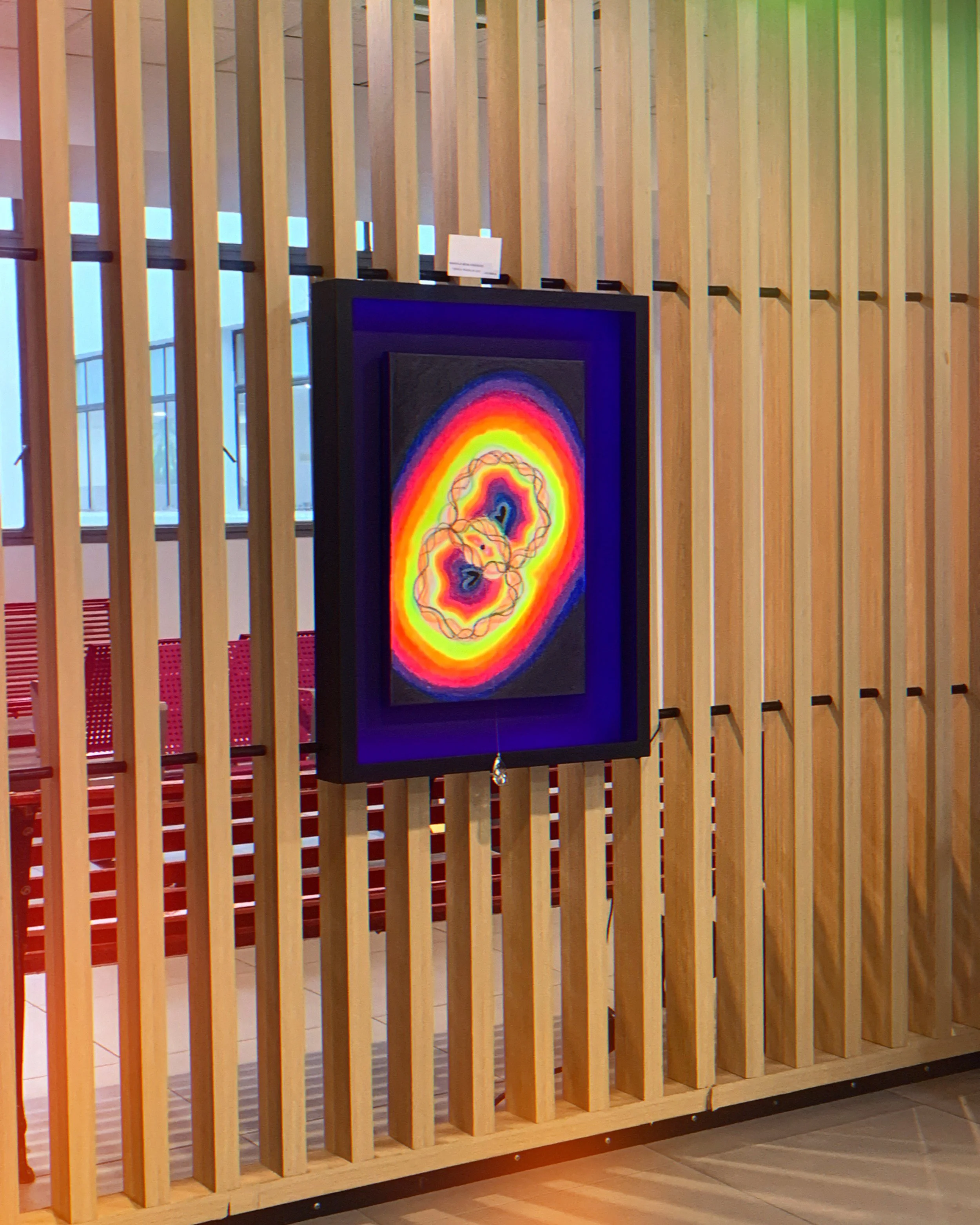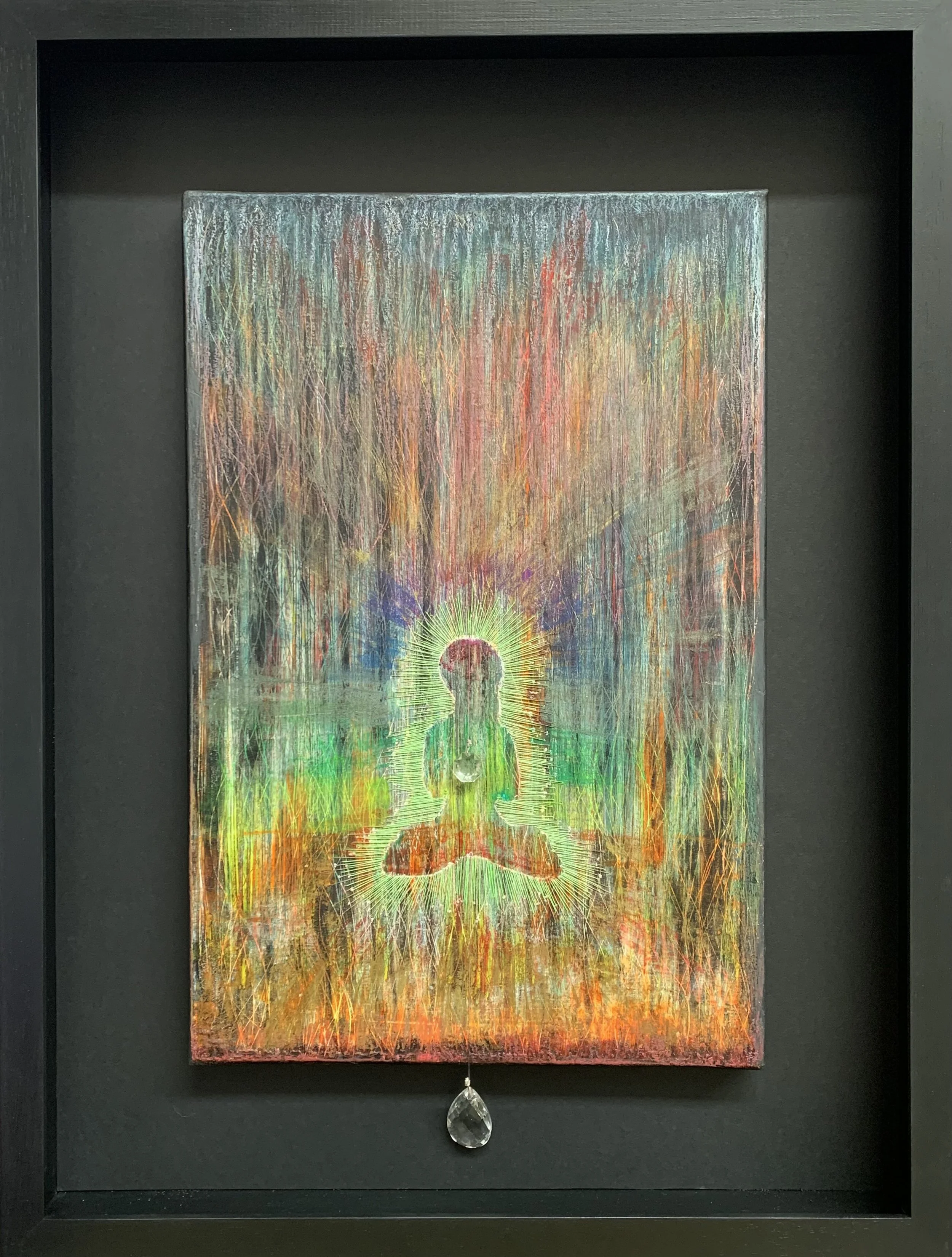 La obra central, En Eje, introduce la serie Las Meditadoras, donde la figura humana y el péndulo se entrelazan en una búsqueda de alineación energética. Con la incorporación de luces LED y materiales lumínicos, la pieza trasciende el plano pictórico para convertirse en una experiencia sensorial, irradiando calma, unidad y conexión.