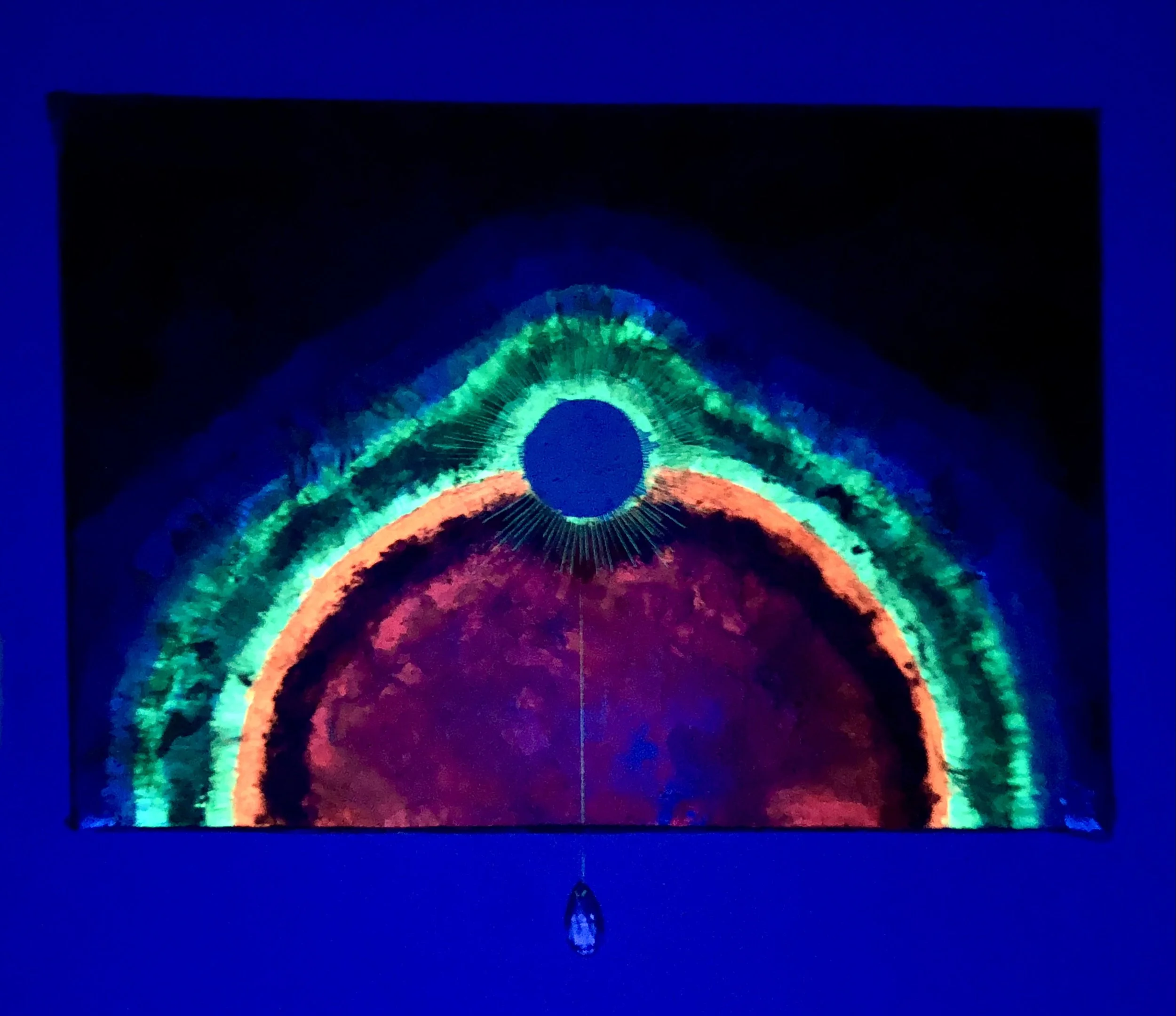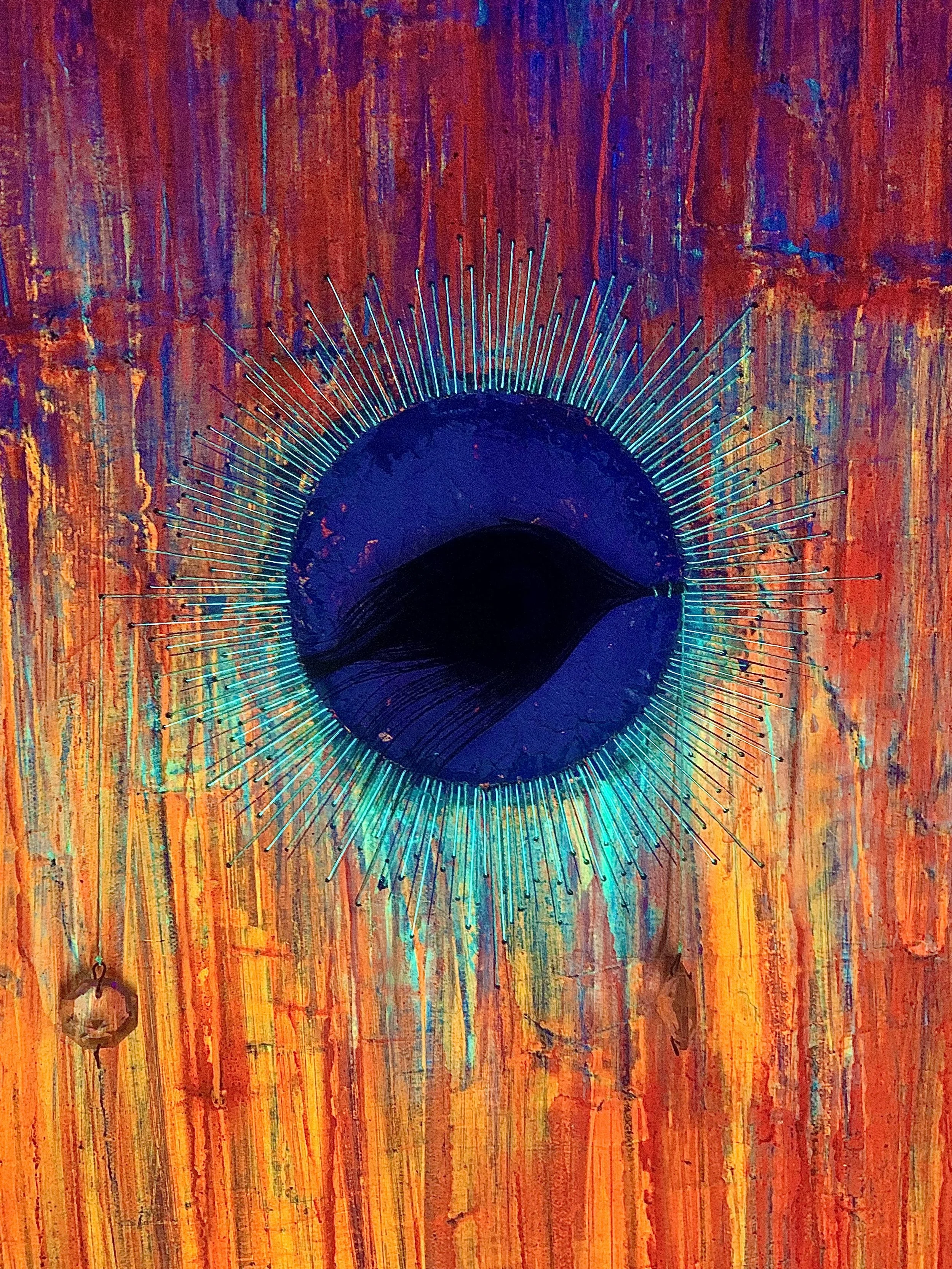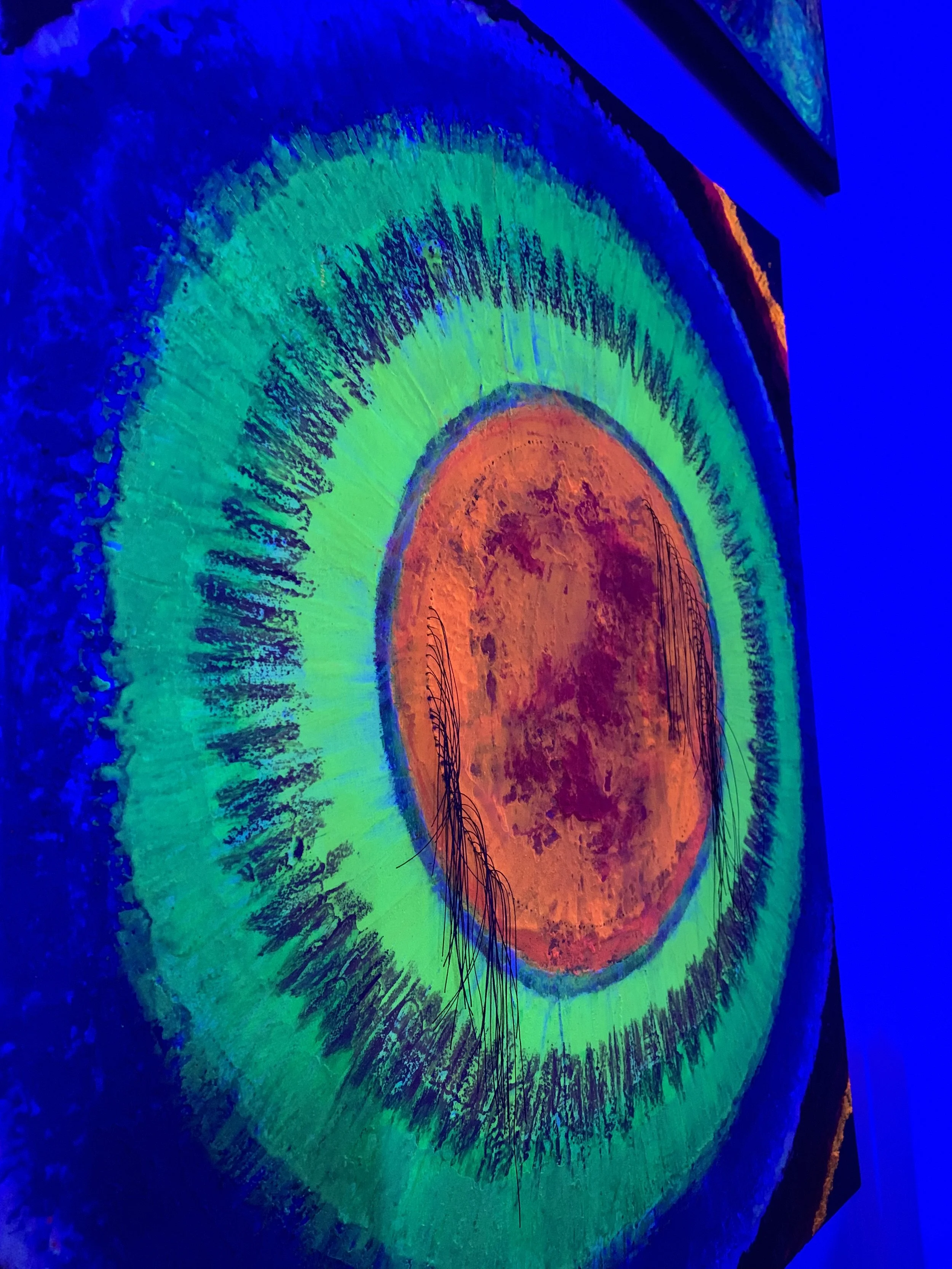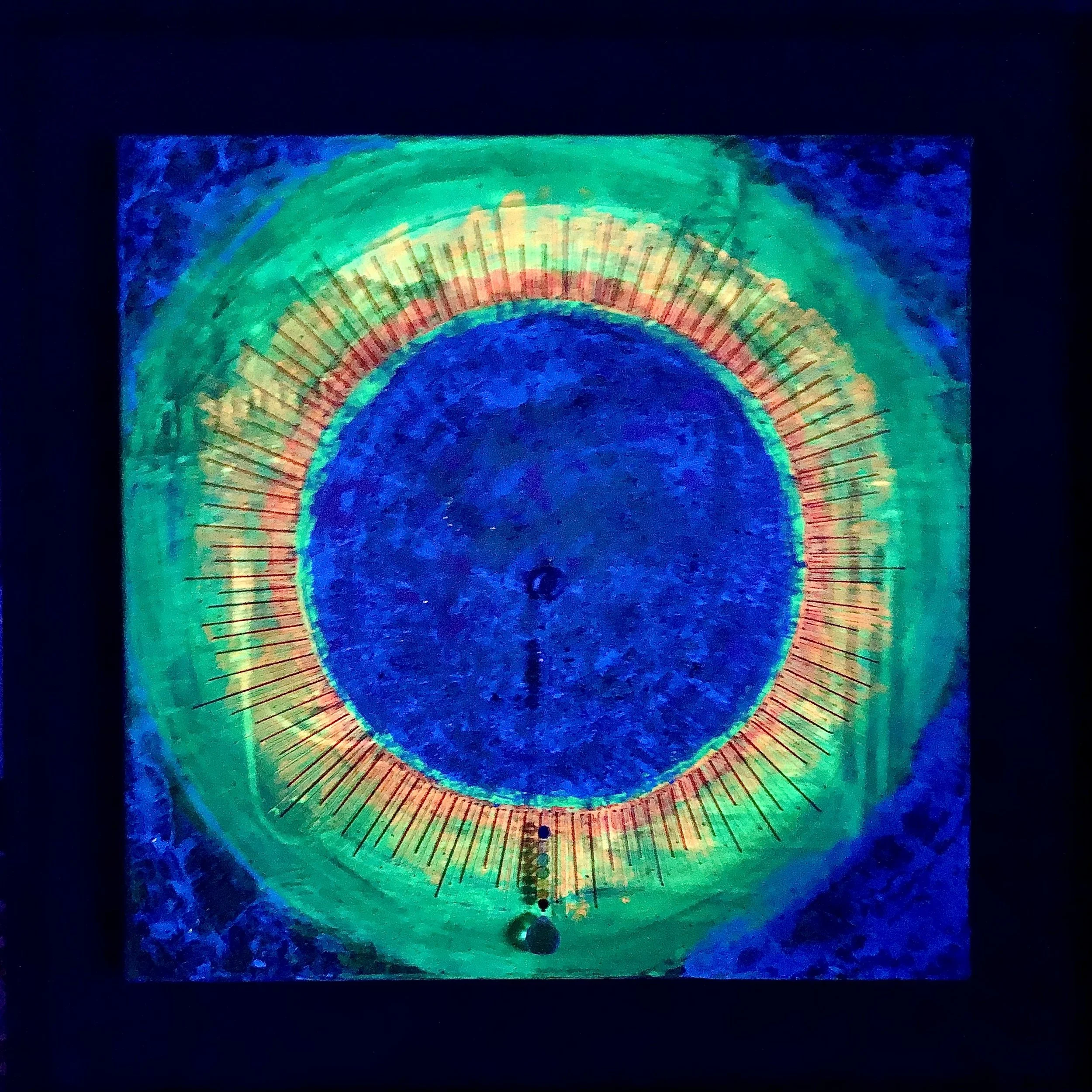 La serie Péndulos explora el equilibrio y los movimientos de la creación. Cada lienzo, perforado y bordado con hilos fluorescentes, conecta el adentro y el afuera como un hilo conductor universal. Estas obras evocan la armonía entre luz, energía y presencia en el universo.