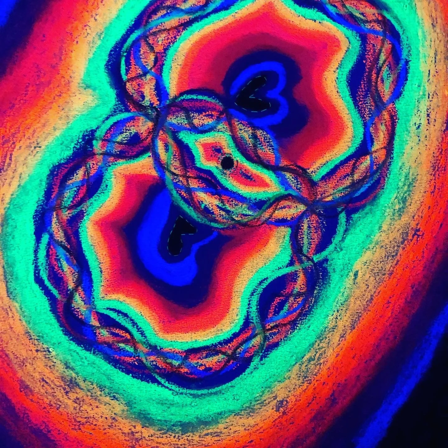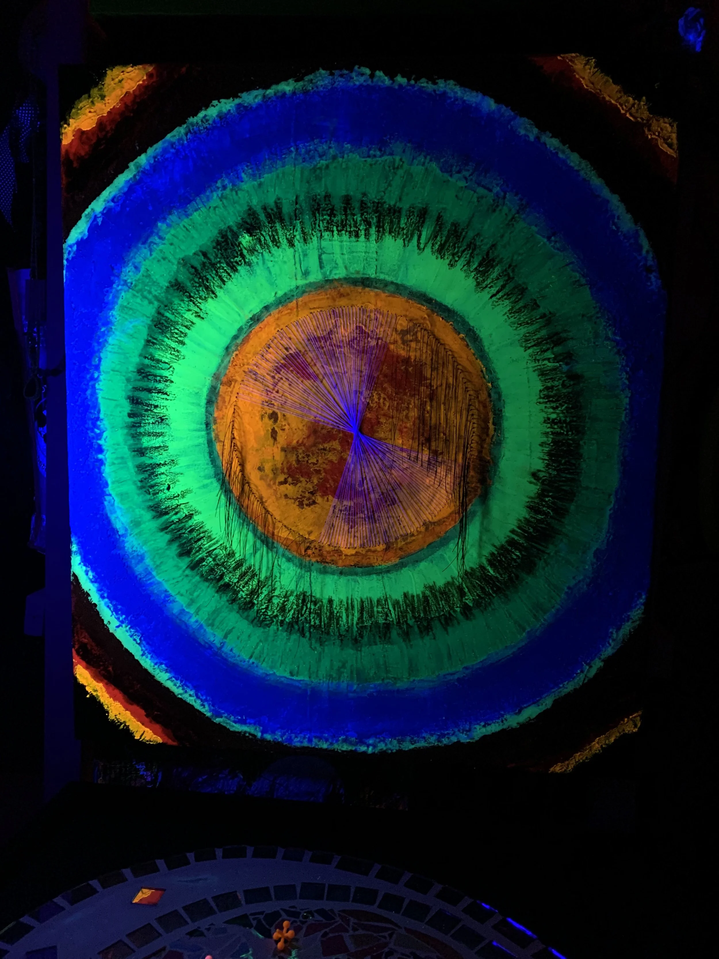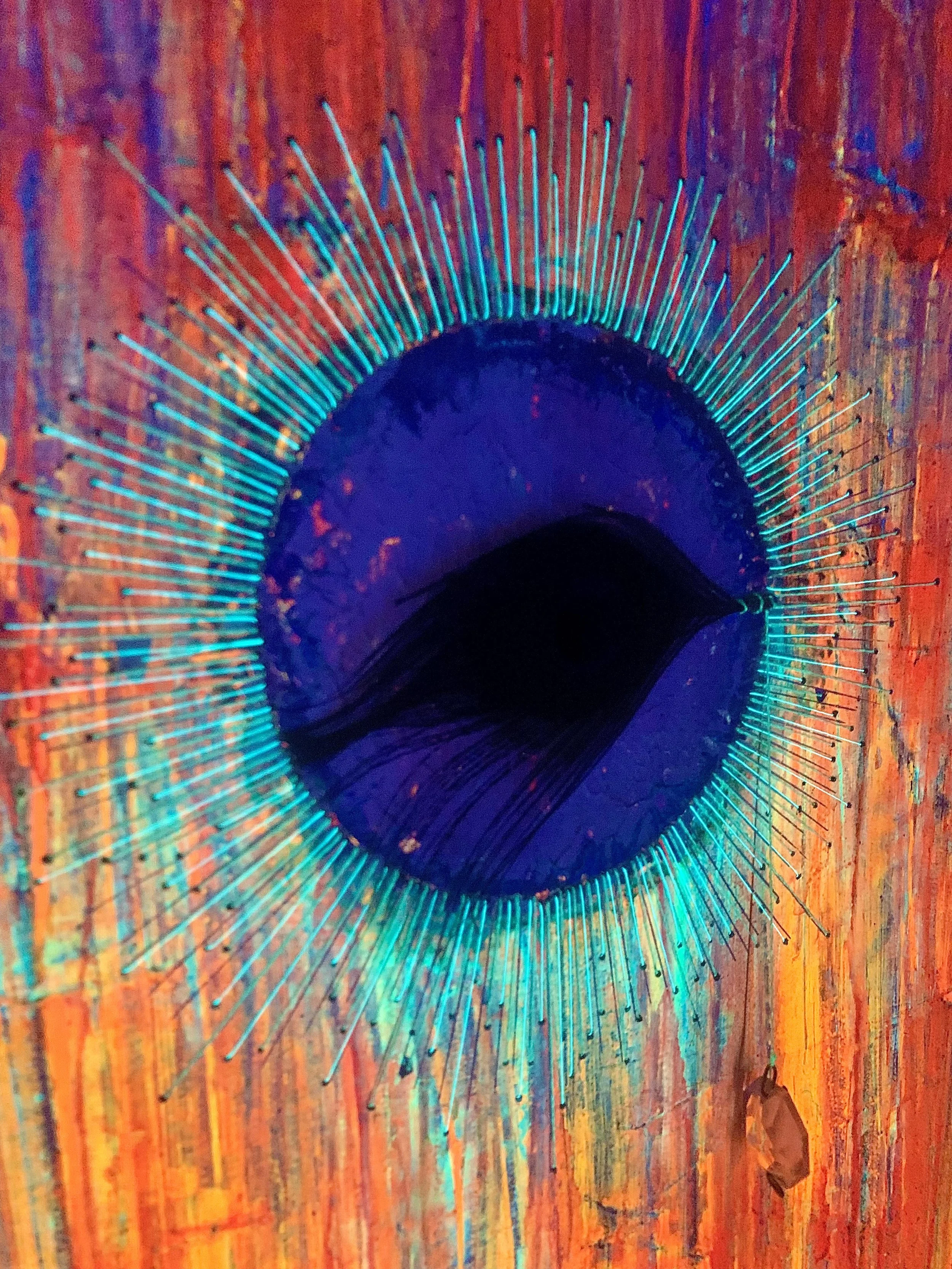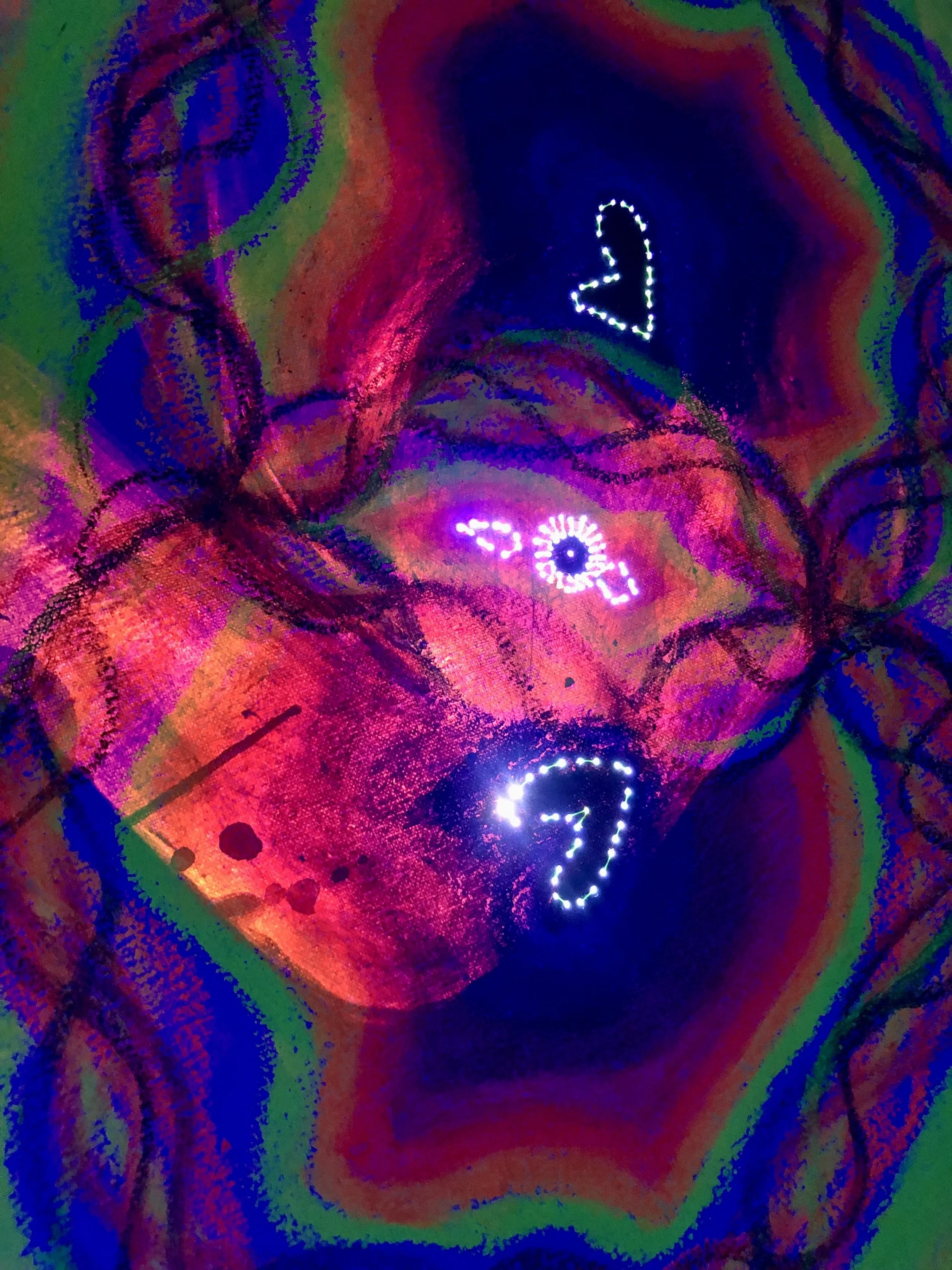 La serie Péndulos explora el equilibrio y los movimientos de la creación. Cada lienzo, perforado y bordado con hilos fluorescentes, conecta el adentro y el afuera como un hilo conductor universal. Estas obras evocan la armonía entre luz, energía y presencia en el universo.