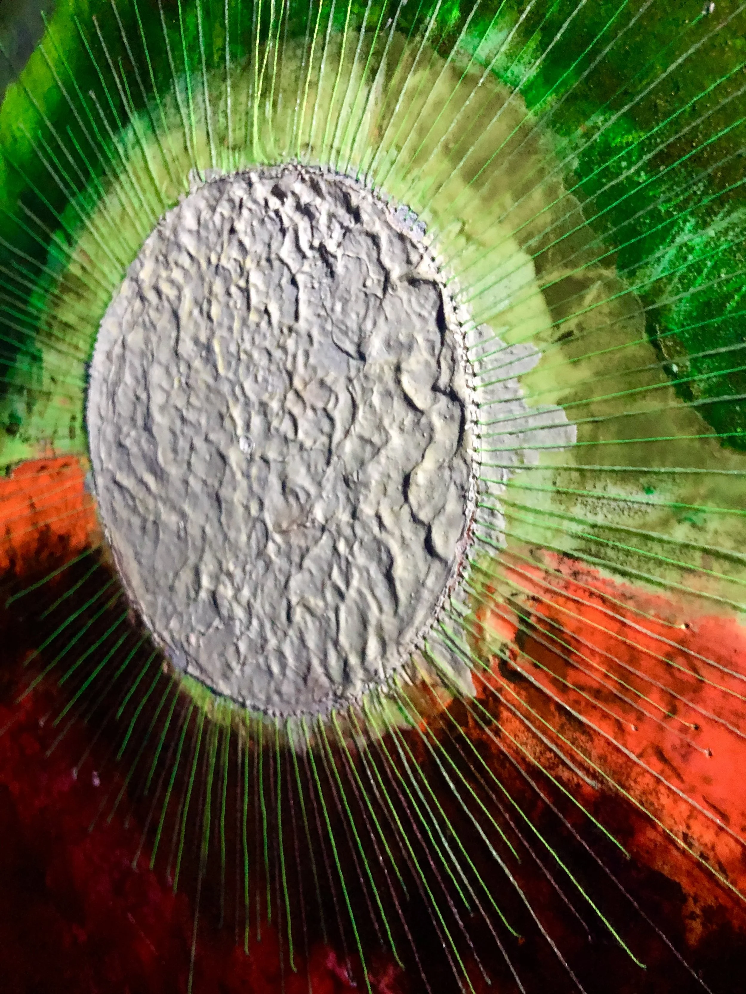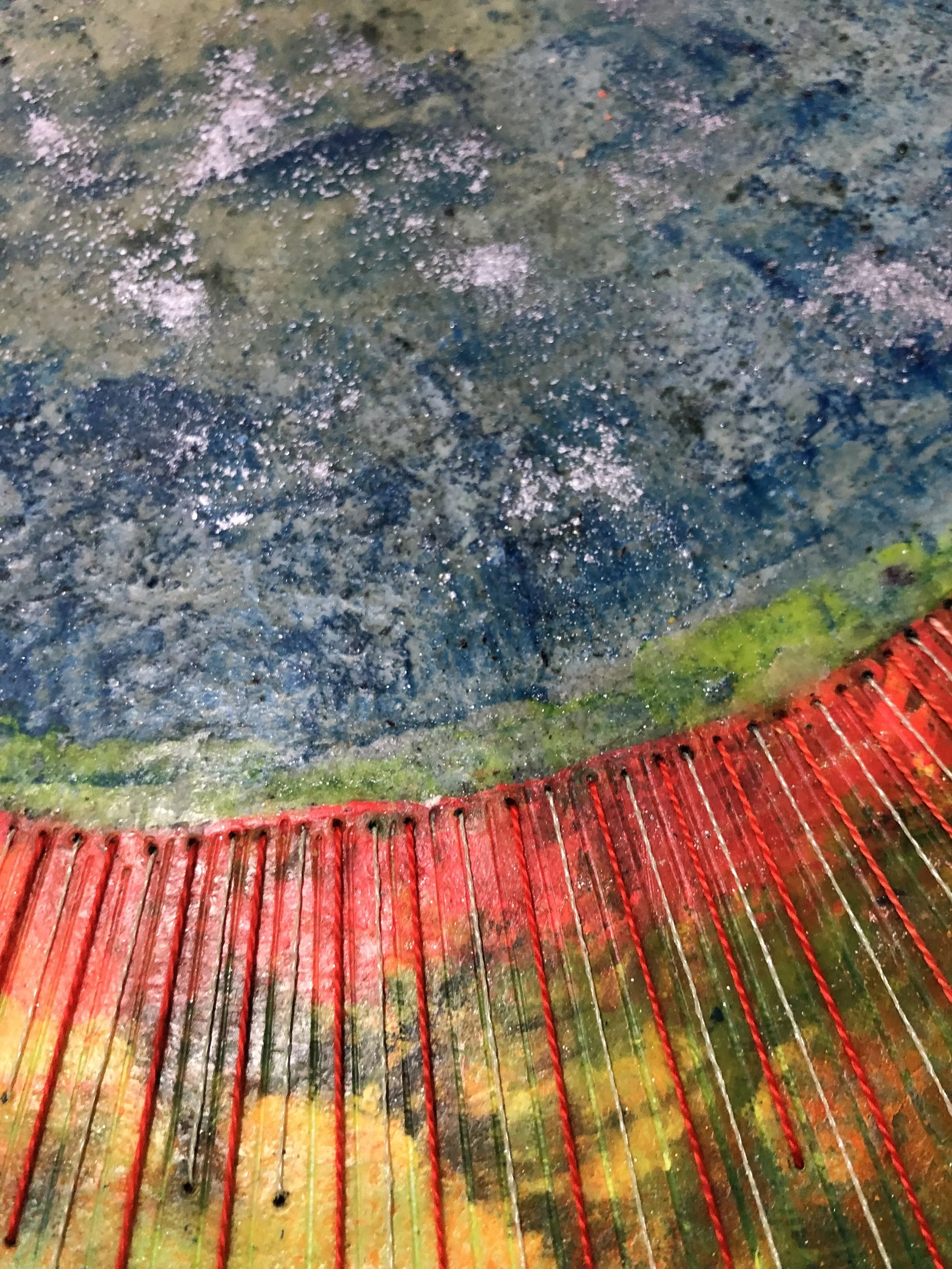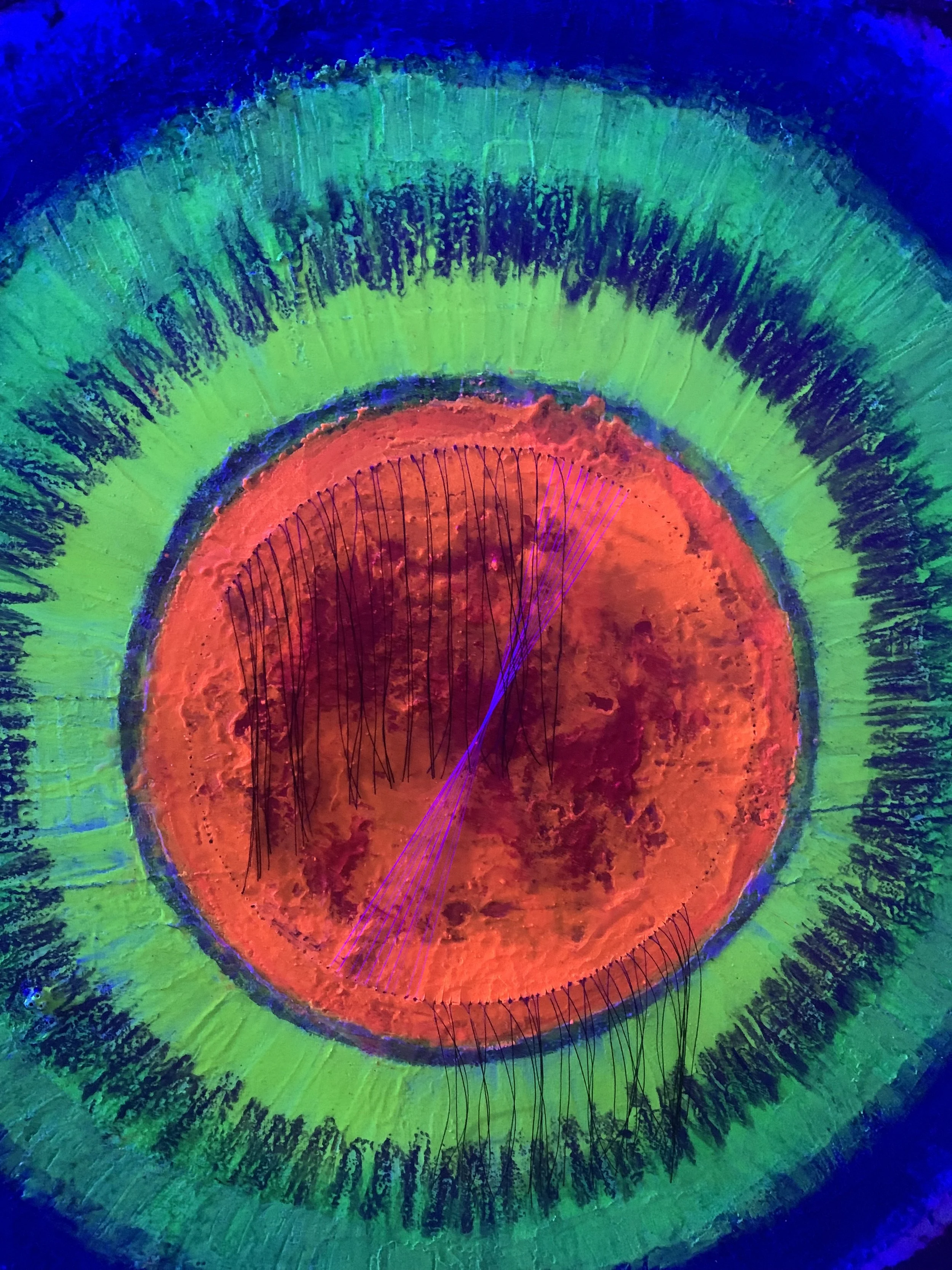 En Péndulos los materiales llevan consigo la memoria de su propia transformación: lienzos descartados que vuelven a nacer bajo la encáustica, superficies atravesadas por la aguja, perforadas y bordadas con hilos fluorescentes que absorben y devuelven la luz.