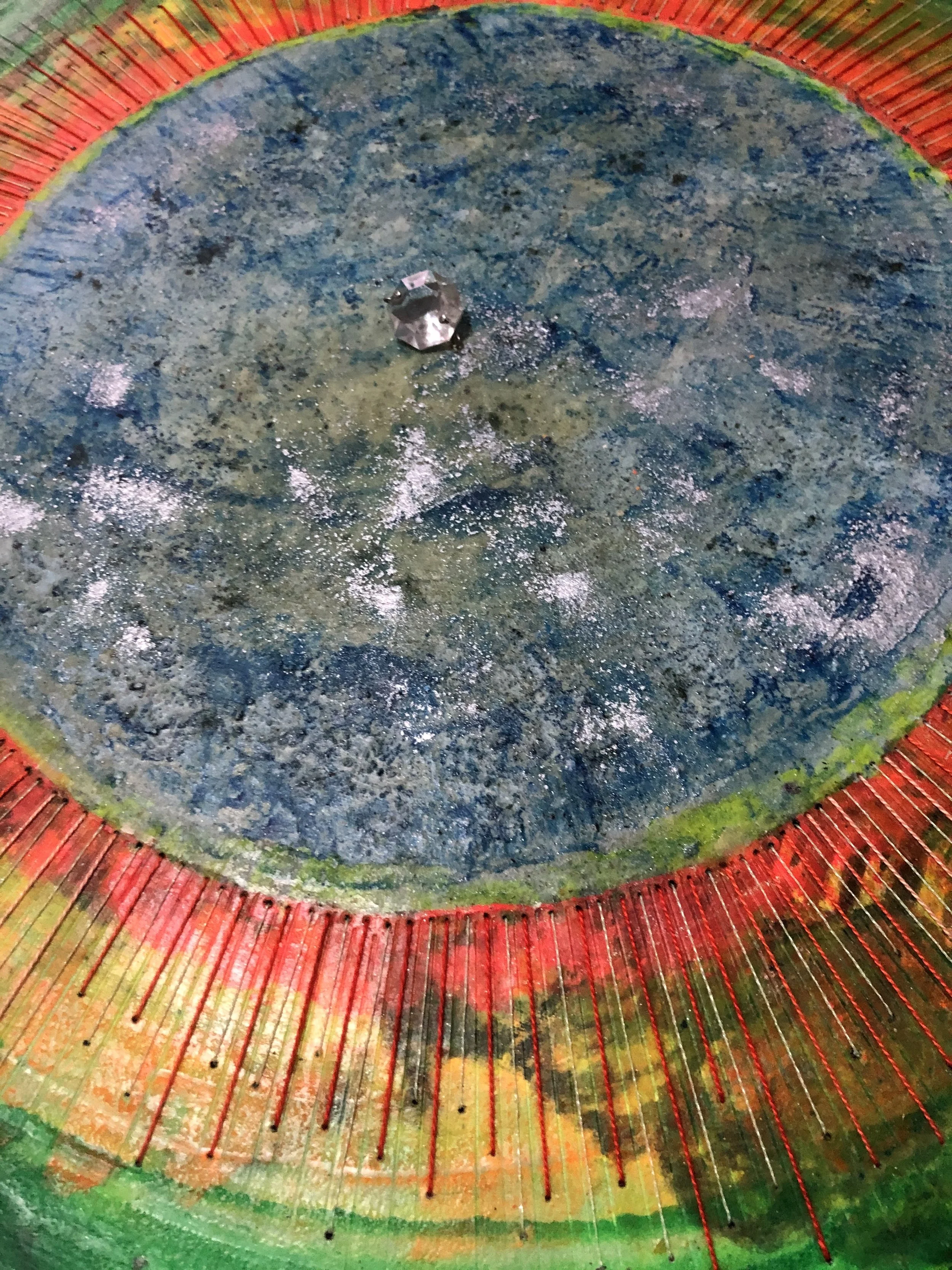 El gesto de bordar se convierte en un acto simbólico: atravesar, salir y envolver con el hilo, como un latido que une lo interior con lo exterior. Este movimiento remite a los patrones de la creación